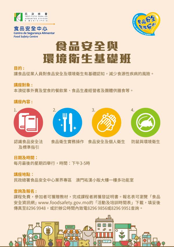 民政總署食品安全中心將於六月二十八日(星期四)在祐漢小販大樓一樓民署食安中心業界專區舉行六月份“食品安全與環境衛生基礎班”,教學內容主要切合餐飲食肆及外賣店舖需要,提升行業的食安知識。課時約兩小時,費用全免,歡迎業界及公眾報讀,完成課程者可獲發證明書。