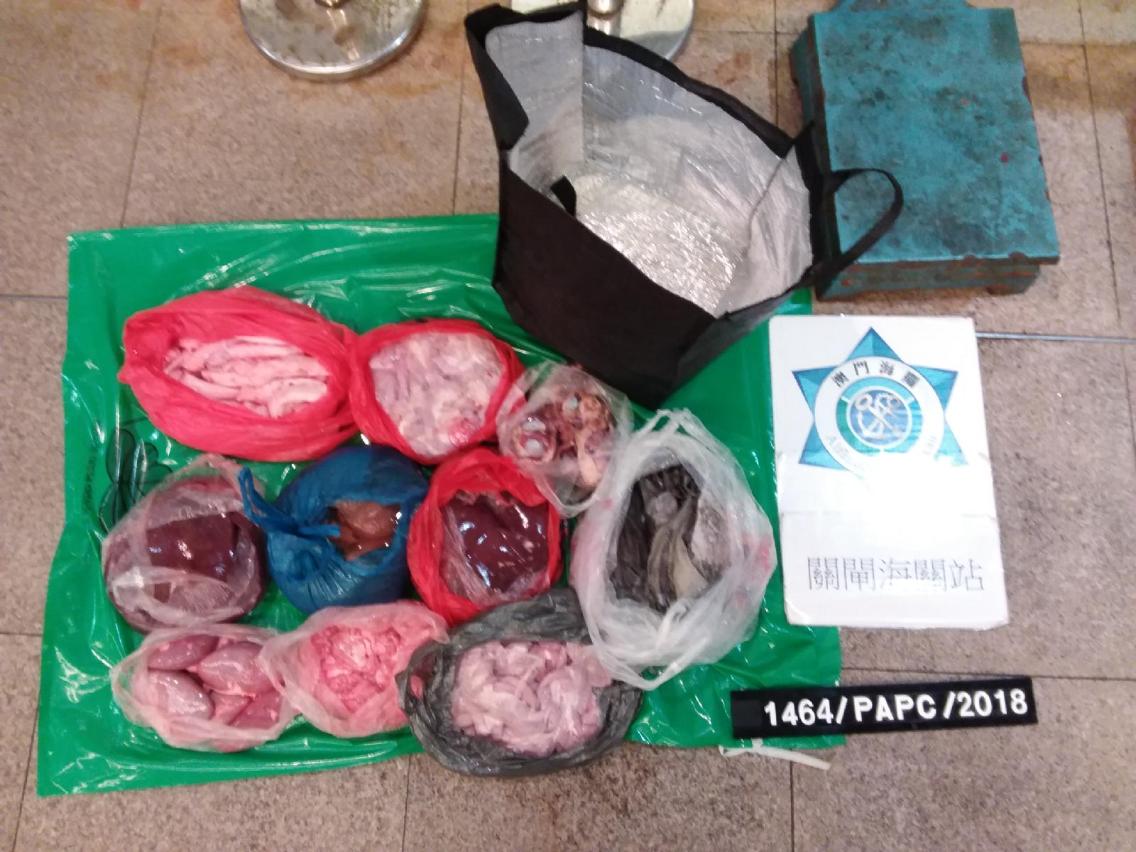 本月13日,一名本澳男子乘坐電動輪椅經關閘口岸進入澳門時,海關關員發現其神色有異,遂向其示意受檢,經檢查在其輪椅後方拖行的手拖車內發現一批新鮮豬、牛內臟及雞肉,合共17.5公斤,上述物品均未經申報及檢疫。