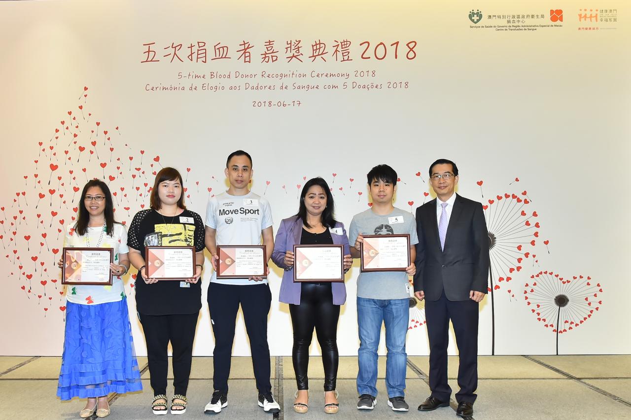 衛生局捐血中心今日(6月17日)舉行了2018年“世界捐血者日”系列活動“五次捐血者嘉奬典禮”,逾二百人出席,其中包括在2017年捐血達5次的717名捐血者,衛生局鄭成業副局長及捐血中心許萍主任向捐血者頒發“五次捐血嘉奬證書”以資感謝和鼓勵。