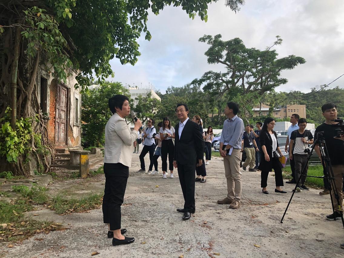 譚俊榮聽取文化局副局長梁惠敏及有關人員介紹九澳聖母村的修復工作,並實地視察現場環境。痲瘋病院五間小屋及教堂,約1885年建成,組成一系列風格統一、充滿建築韻律感的建築群,其後更名為九澳聖母村。