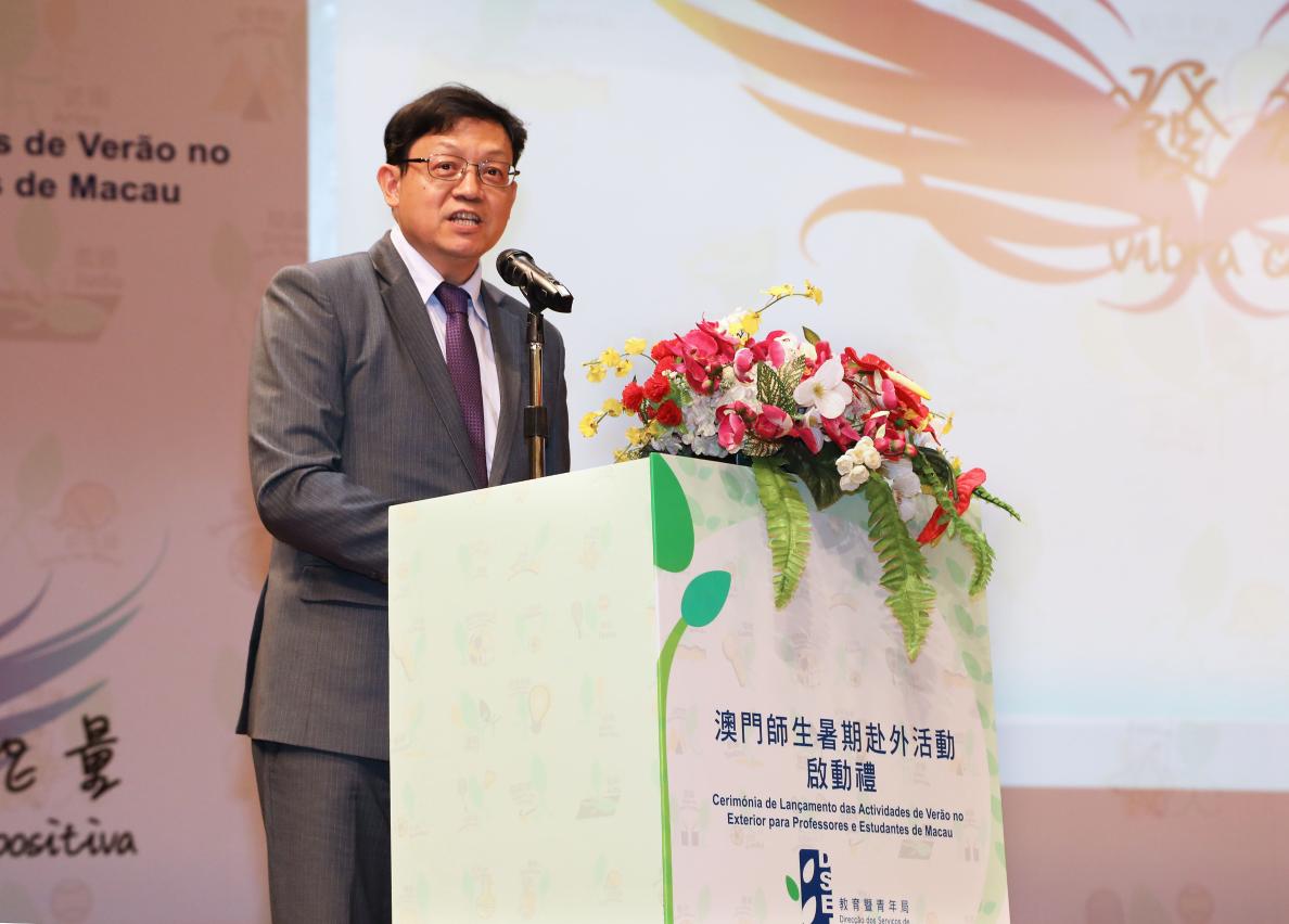 啟動禮上,譚俊榮把澳門特區區旗交予赴外活動總團長老柏生,再由老柏生把澳門特區區旗交予師生代表,寓意全體團員將代表澳門特區的師生前往不同地方進行文化交流和學習。老柏生在致辭中勉勵師生們,特區政府不斷完善教學制度,加大資源投放,優化各項條件,以提升教學質量,而在多項工作中,教青局十分支持師生出外學習和交流,以擴闊視野,增進友誼,提升個人素養和能力。
