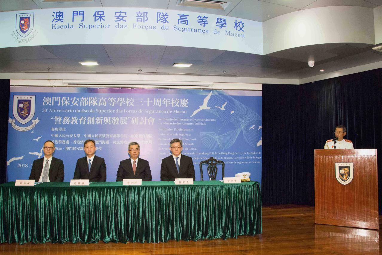 保安司黃少澤司長致辭時表示:三十年前,澳門保安部隊高等學校因應澳門回歸祖國對保安部隊領導和主管人員本地化的需要而成立,澳門回歸後,保安高校的校務隨着澳門特別行政區對保安部隊人員培養的需求而得到迅速發展和壯大,特別行政區第四屆政府成立以來,保安高校持續貫徹落實保安範疇“主動警務”、“社區警務”和“公關警務”三個新型警務理念,辦學理念和各項校務工作更加取得了實質的飛躍和創新。三十年來,特別是自從特別行政區第四屆政府成立以來,保安高校在持續開展教學培訓、為保安部隊輸送合格人員的同時,亦不斷舉辦各類學術和實務交流研討活動,致力提升本澳警學理論水平,更不忘藉着多元化活動拓展與社會的接觸層面,促進警民互動。