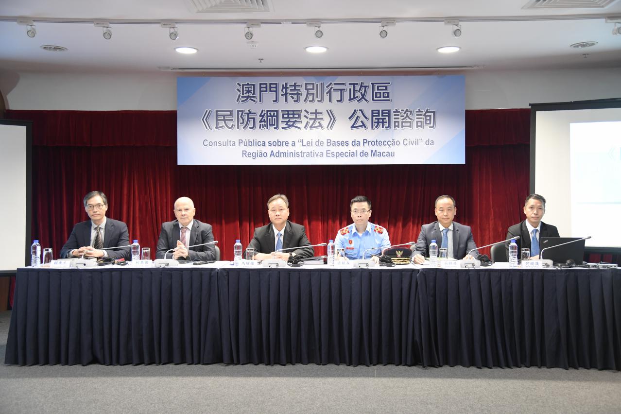 為期四十五日的《民防綱要法》公開諮詢於2018年6月28日起展開,澳門特別行政區政府迄今舉行了四場團體諮詢會,分別於7 月2日、3日、5日及6日在治安警察局出入境事務廳大樓禮堂進行,約380名分別來自民防架構成員、公共部門、社會團體、義工機構、醫療業界、教育團體及相關學校、物管、建築工程、運輸業、旅遊、酒店及博彩業等代表出席。諮詢會上多名代表發言,包括公共部門、高等院校、社會團體、醫療業界、客運、旅遊業、職業介紹所、酒店業界等,收穫眾多提問和寶貴意見。
