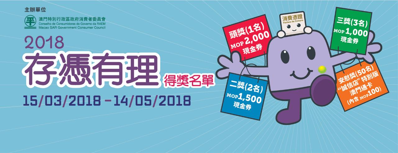 “存憑有理 - 2018"抽獎活動的得獎名單已上載於消委會網頁(www.consumer.gov.mo)供參加者瀏覽。