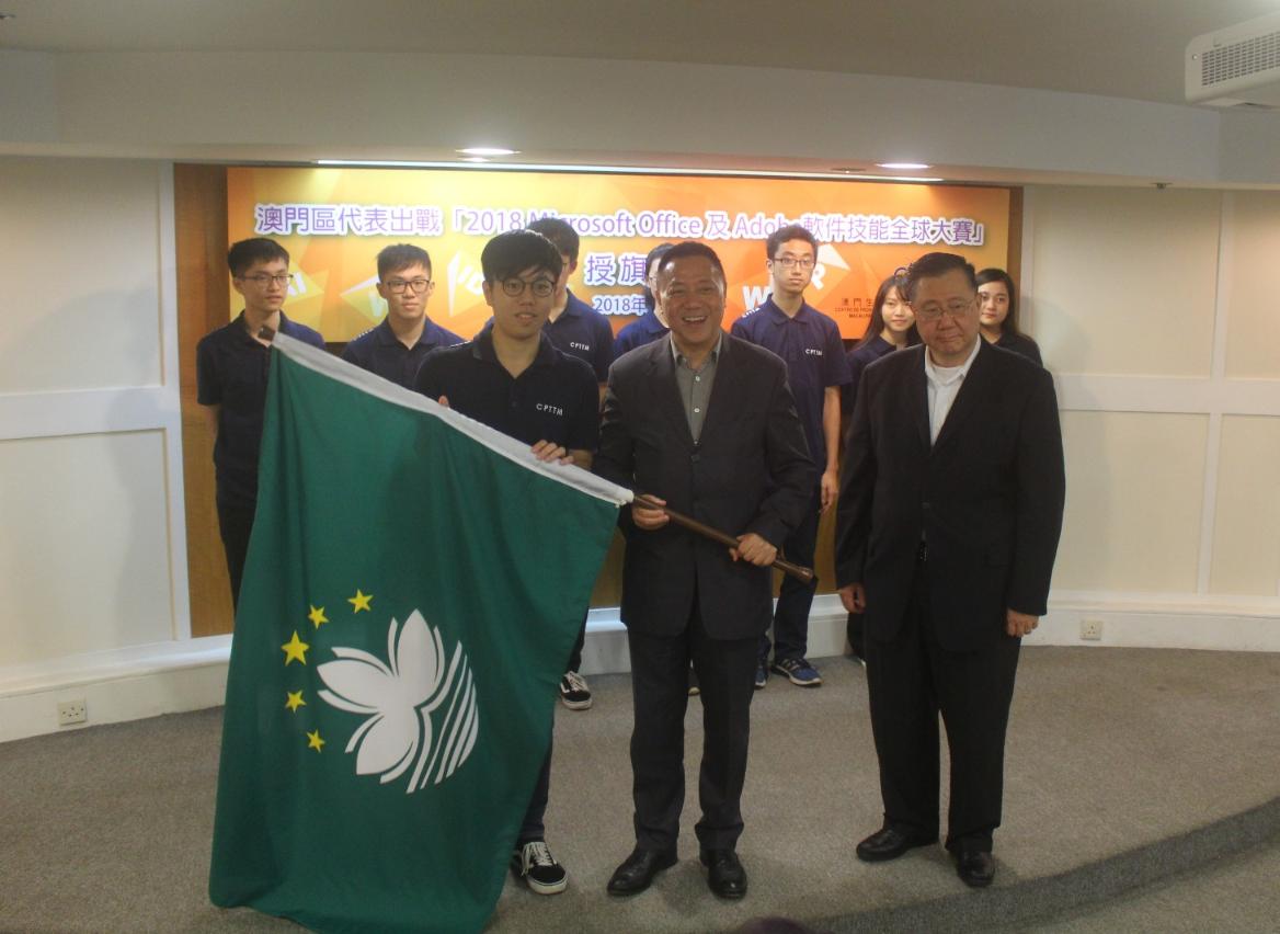 經濟財政司司長梁維特向將往美國參加「2018 Microsoft Office及Adobe軟件技能全球大賽」的學生代表授澳門特別行政區區旗,並鼓勵他們發揮最高水平,為澳增光。
