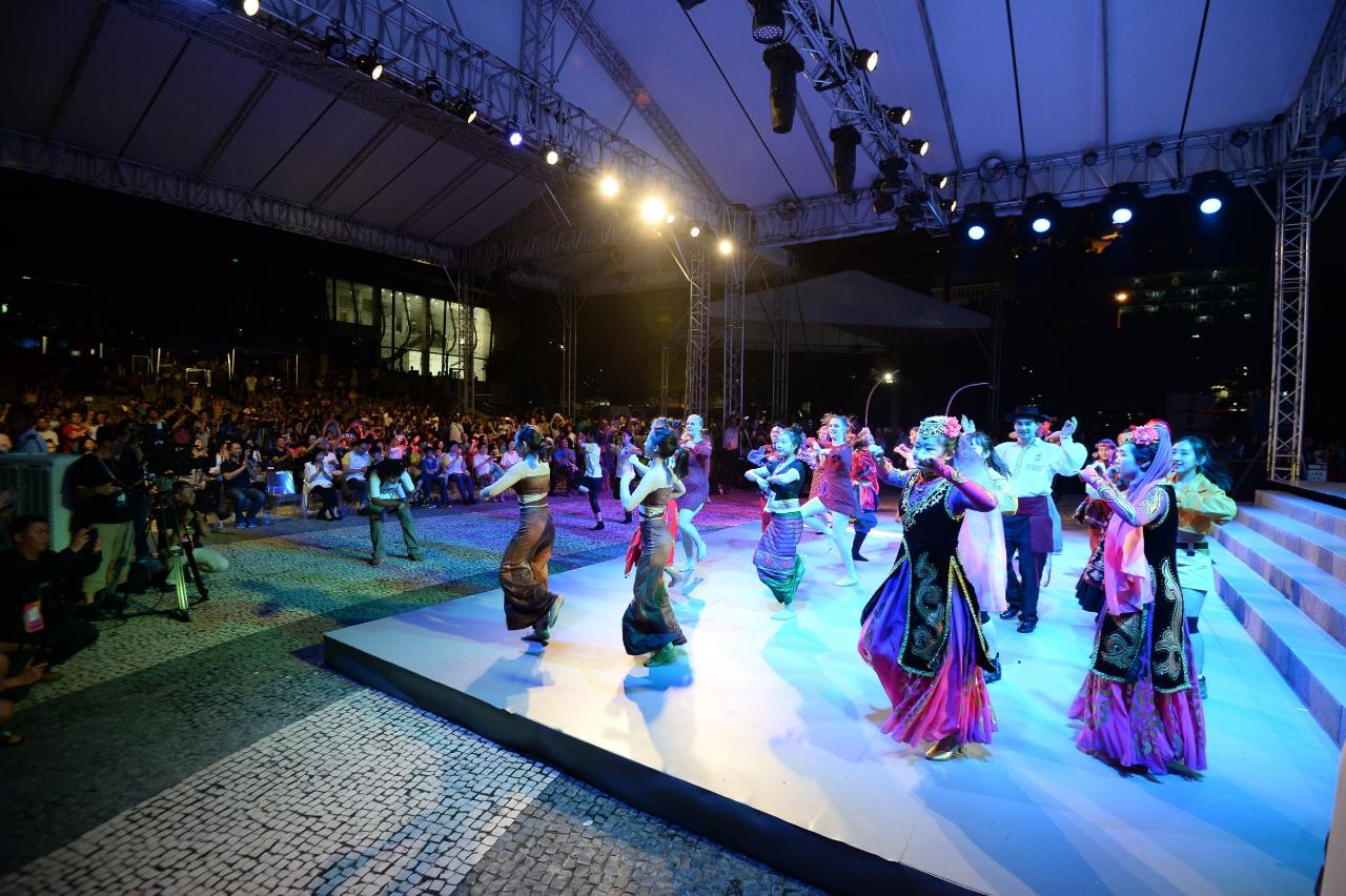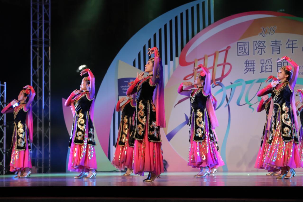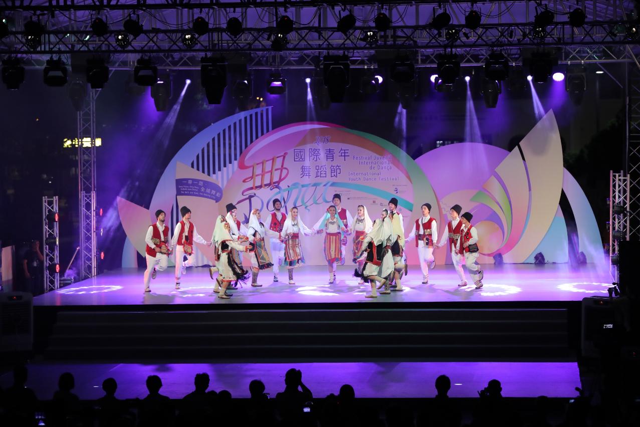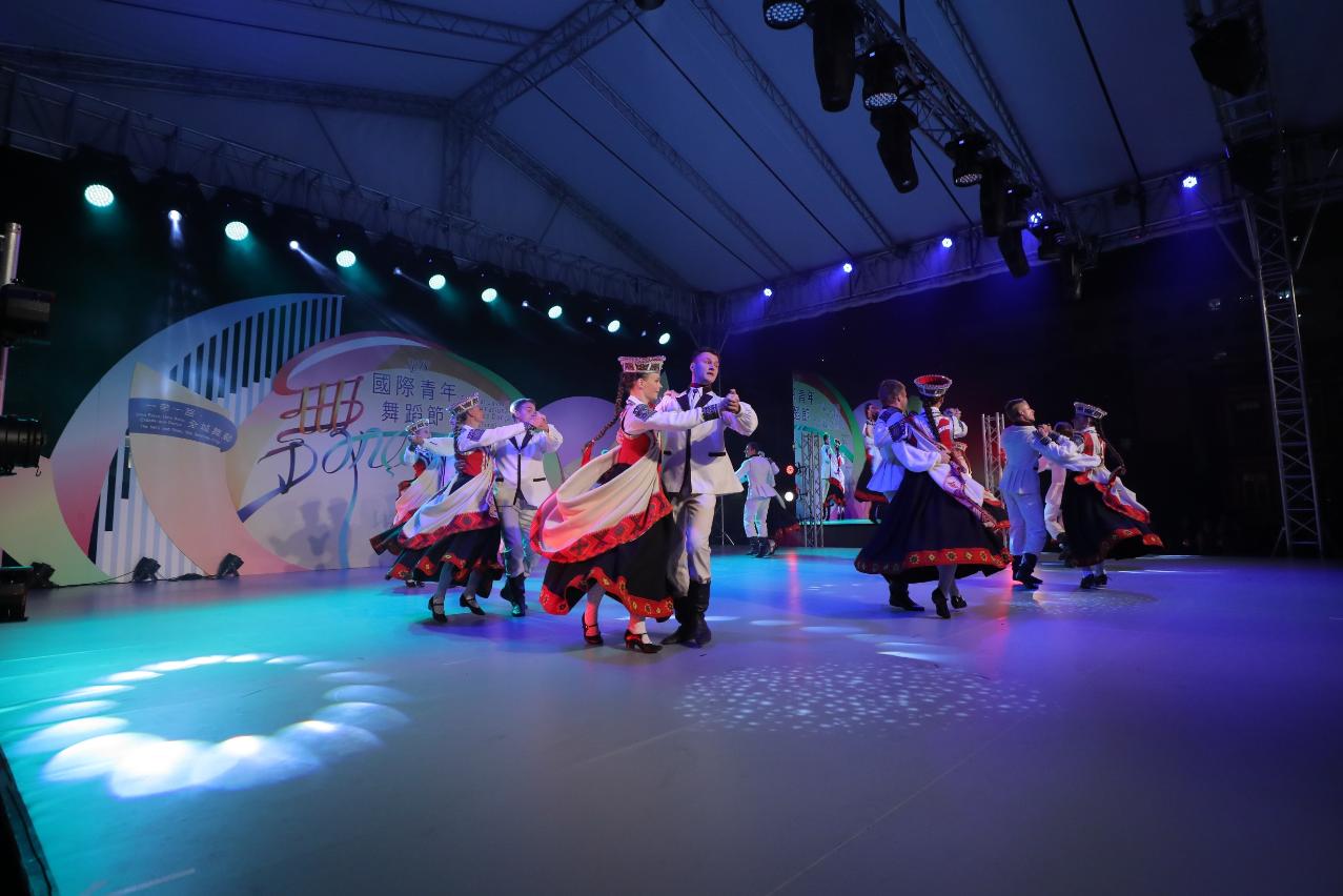 晚上舞台燈光亮起,一班來自世界各地的青年舞蹈員聯合演出《絲路西域》大型主題舞蹈,讓現場觀眾感受到彷如置身古代絲綢之路當中,並體現由青年舞蹈員團結和合作所產生的能量,在有限時間共同排練大型主題舞蹈並作演出。接着,還有拉脫維亞珀爾舞蹈團、挪威雷特士舞蹈團、中國澳門流行歌舞協會、土耳其伊斯坦堡技術大學土耳其音樂學院土耳其民族舞蹈學系、加拿大DS舞蹈青年舞團、中國澳門菜農子弟學校舞蹈隊、芬蘭他狄杜麥民間藝術團、中國四川省藝海舞蹈、斯洛文尼亞采列舞蹈論壇、波斯尼亞和黑塞哥維那代爾文塔“羅勒”青年文化藝術協會陸續出場,為觀眾帶來精彩多元的舞蹈,戶外演出在觀眾熱烈掌聲中結束。