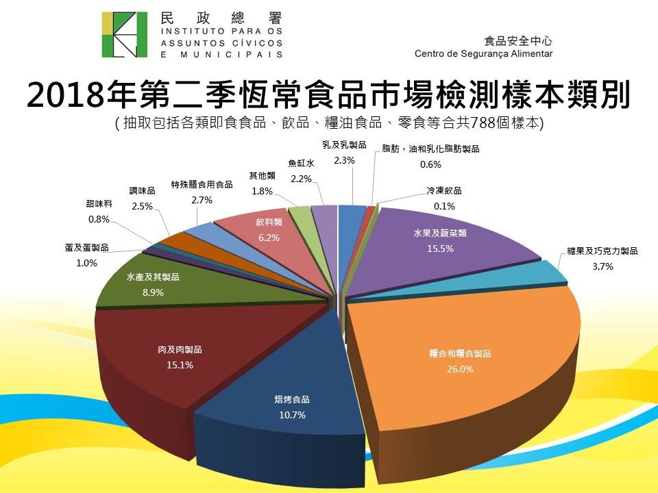 民政總署持續透過恆常食品監察及檢測機制,評估市面售賣食品的風險及衛生狀況。食品安全中心在本年第二季抽取了七百八十八個食品樣本進行檢驗,整體合格率達99.9%。