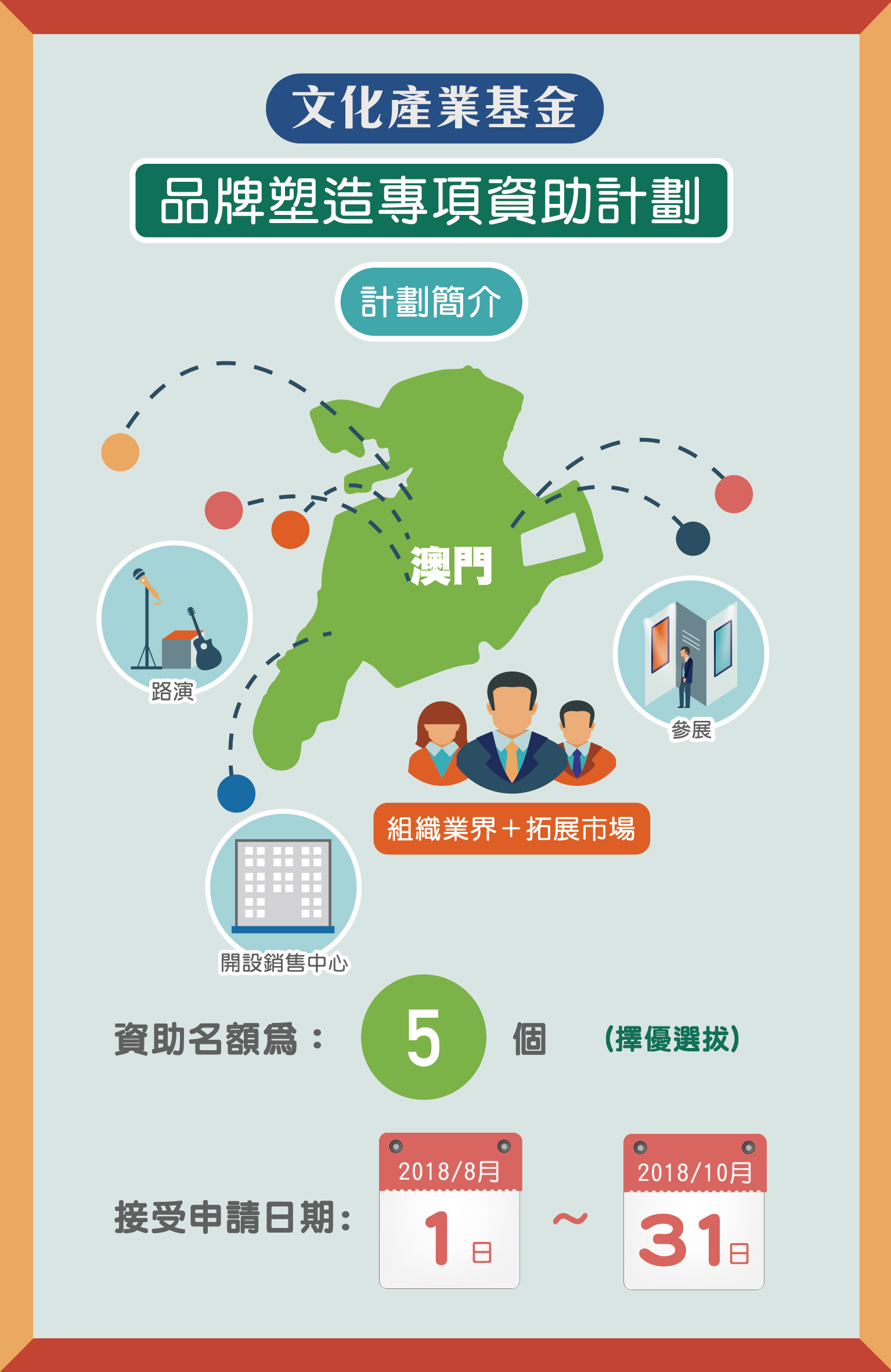 文化產業基金推出《品牌塑造專項資助計劃》,重點支持時尚/時裝、設計、文化展演及影視領域,鼓勵進行跨領域合作,通過參展、路演和線上線下開設品牌產品銷售中心等方式拓展市場,尤其是“粵港澳大灣區”及“一帶一路”地區的巿場,打造創新、具競爭力的文化產業和文創品牌,走出澳門。