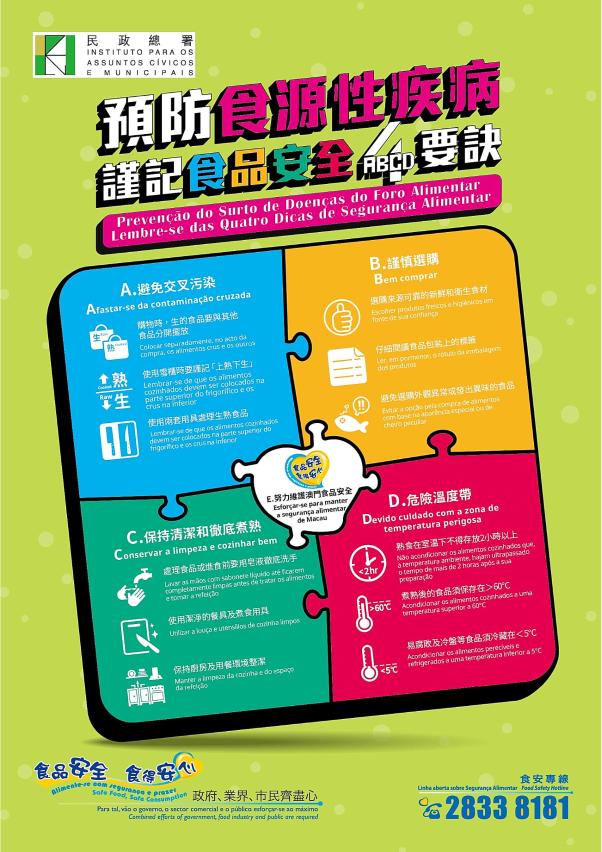 民署一直致力推動食品安全教育工作,為本澳食品從業人員提供更全面的教育資源及在職培訓,長遠提升本澳食品行業的衛生及安全水平。二零一八年起恆常於每月最後的星期四舉辦“食品安全與環境衛生基礎班”,以食品安全衛生指引輔以食安中心編制的《外賣及堂食處理食品衛生指南》作為教材,內容涵蓋由採購、貯存、處理方式、個人衛生等食品安全注意事項,以及日常操作中容易忽略的食安要點;同時,將講授由民署編輯的一套多語文版本“食品安全4要訣ABCD”,內容圍繞避免交叉污染(Avoid Cross Contamination)、謹慎選購(Buy Right)、保持清潔和徹底煮熟(Clean and Cook Completely)以及危險温度帶(Danger Temperature Zone),鼓勵不同語言及文化背景人士學習,並運用在日常烹調製作食物之中,教導食品從業人員如何防範及減少食源性疾病發生的風險。講座亦會介紹《食品安全法》的主要內容,加深業界認識法律中所訂明的責任與義務,呼籲業界與政府應保持良好溝通,通報可能存在的食品風險,完善本澳食安工作。