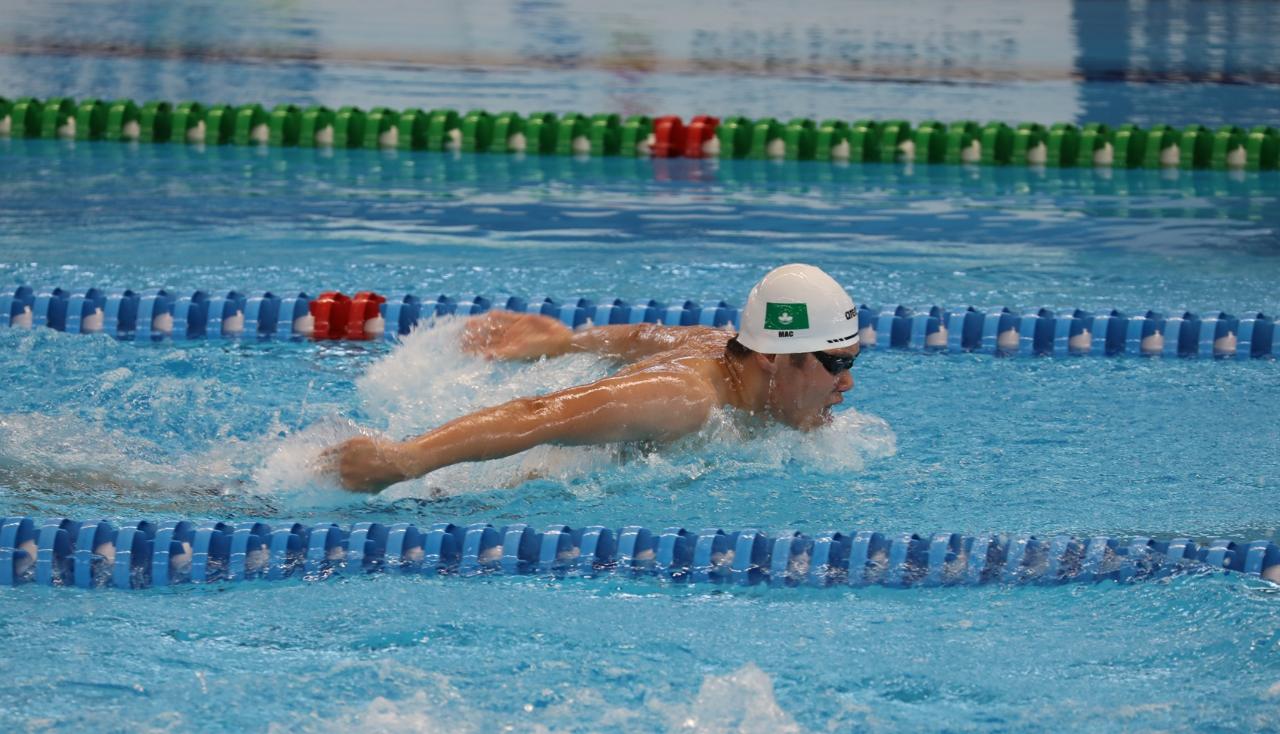 游泳進行了多項預賽,男子100米仰泳,任正文(YUM CHENG MAN)1分02秒63完成賽事;男子200米蝶泳,林思庄(LIN SIZHUANG)2分11秒16完成賽事;利安琪(LEI ON KEI)和鄭詠琳(CHEANG WENG LAM)於女子100米蛙泳,分別游出1分16秒06及1分15秒19的成績,上述四人均未能晉級。女子4x100米自由泳接力,利安琪、黃文慧(VONG ERICA MAN WAI)、龍子惠(LONG CHI WAI)及譚志欣(TAN CHI YAN)隊伍游出3分59秒49的成績,打破了澳門紀錄並晉級決賽 ,最後取得第8名兼破澳門紀錄。