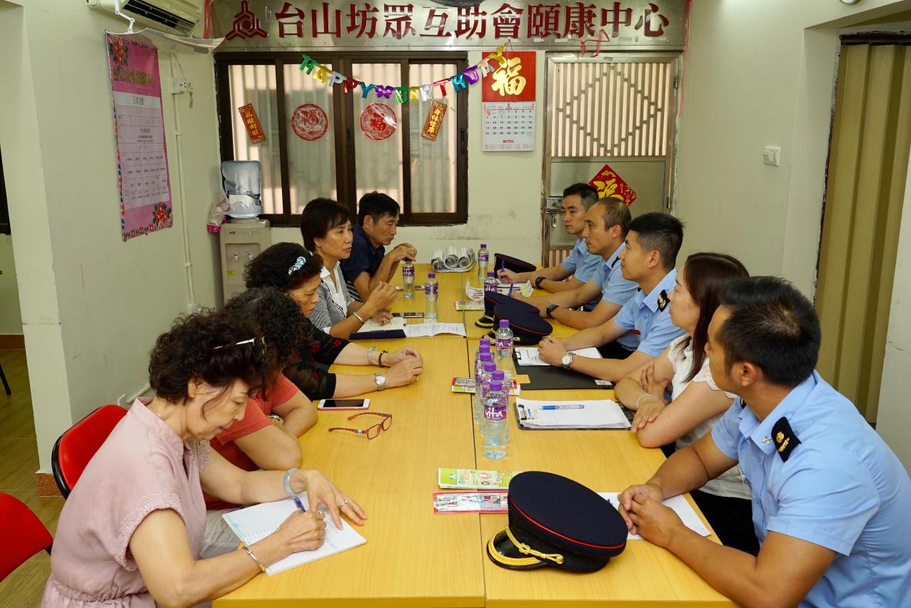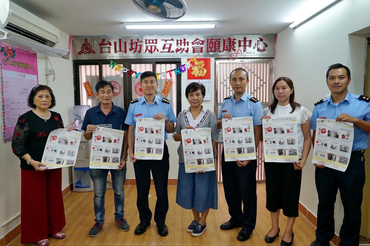消防局於8月23日派出官員拜訪“台山坊眾互助會”進行座談,以及聽取坊會就防火、滅火及救援等工作的意見,亦為坊會及區內一帶居民舉辦一場防火講座,以及講解颱風來臨前的防災準備及防災知識,並向區內居民派發各類消防安全、防災應急宣傳單張,藉此加強居民的防火、救護、安全使用爐具及防災避險意識,從而保障生命及財產安全。