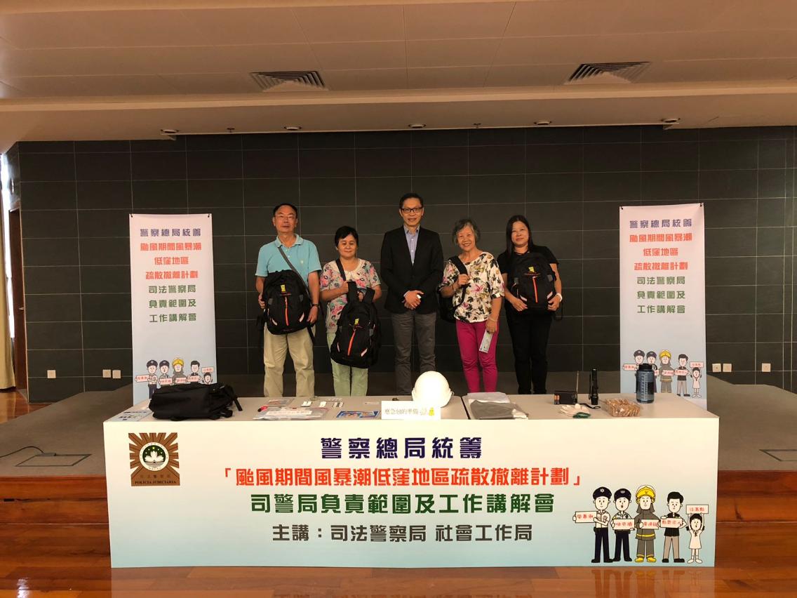 為提高市民對風暴潮撤離工作的認識,加強市民的防災避險意識,司法警察局在警察總局統籌下持續進行“颱風期間風暴潮低窪地區疏散撤離計劃”宣傳工作,9月1日下午,司警局聯同社會工作局在下環活動中心禮堂舉辦相關講解會,向市民介紹上述計劃的目的、內容、撤離措施及個人的防災準備,以及有關避險中心及緊急疏散停留點等撤離資訊,以確保當風暴潮撤離計劃啟動時,市民能迅速遵照民防單位的指示有序安全撤離。
