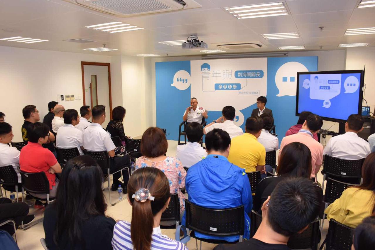為加深本澳青年對海關工作的認識,建立正確的價值觀,澳門海關今日(1日)於青洲海上監察廳舉行「青年與副海關關長真情對話」,與澳門青年聯合會約四十位年青人互動交流。吳國慶副關長以「勇迎挑戰.發掘機遇」為主題,分享澳門海關成立以來的發展,以及自身的工作體會,勉勵青年勇於在挑戰中尋找機遇,實踐抱負。