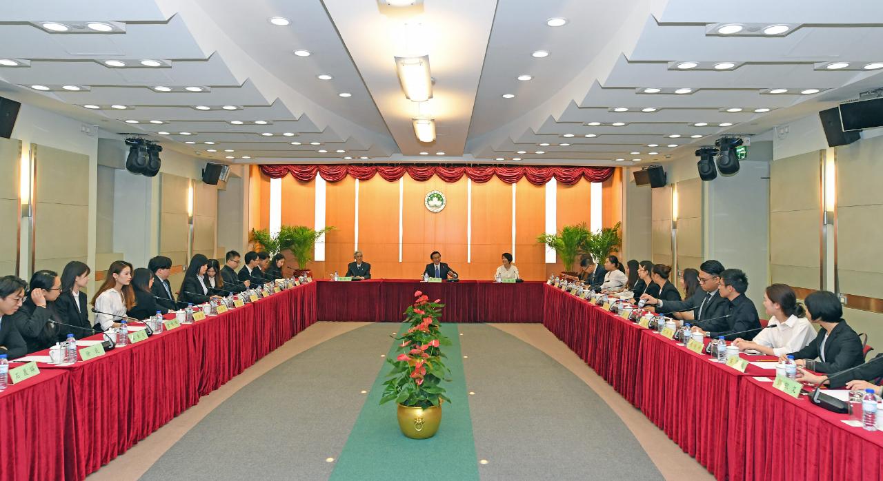 研究生會成員在學生事務長彭執中和學生發展特別顧問周桂慈帶領下,拜訪澳門特別行政區社會文化司,獲譚俊榮和司長辦公室顧問何麗鑽熱情接待。譚司長歡迎來自不同地區的學生齊聚澳大深造,並指澳大的學術氛圍、師資力量和基礎設施等方面的優勢有助學生更好地進行學習與生活。譚司長同時鼓勵同學抓住粵港澳大灣區的建設和發展機遇,把握社會形勢和澳門特區的優勢,將自身所學與區域發展機會結合起來,提升就業能力,進行理性創業。對於有成員提出的有關工作實習和畢業後發展的困惑,譚司長以自身求學經歷為例,勉勵同學們在求學的路上砥礪前行。