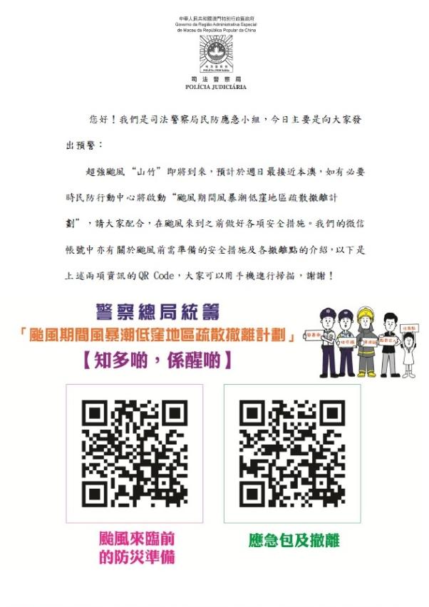 此外,該局人員亦為商戶及居民提供關於颱風來臨前的防災準備、應急包、撤離計劃及緊急求助等的圖文資訊,呼籲大家提高警覺,並將相關資訊轉發予家人及朋友,未雨綢繆,及早做好應對措施。