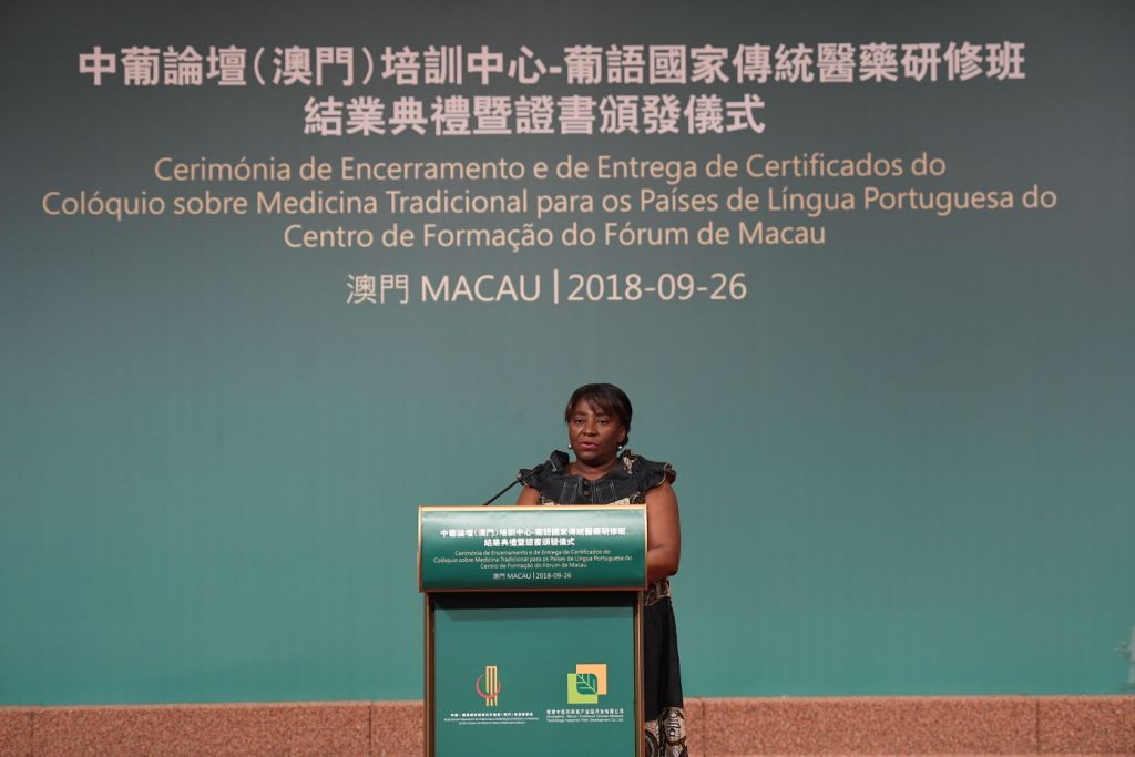 中葡論壇(澳門)常設秘書處徐迎真秘書長、中央人民政府駐澳門特別行政區聯絡辦公室經濟部張建華副部長、安哥拉駐澳總領事Sofia Pegado da Silva女士、莫桑比克駐澳總領事Rafael Custodio Marques先生、粵澳中醫藥科技產業園開發有限公司謝毅副行政總裁、中葡論壇(澳門)常設秘書處丁恬副秘書長(中華人民共和國指派)、羅德高副秘書長(葡語國家指派)、吳愛華副秘書長(澳門特區指派)以及論壇各葡語國家派駐代表等出席典禮。徐迎真秘書長、謝毅副行政總裁和研修班輪值班長Domingas Batista de Sousa女士分別致辭。