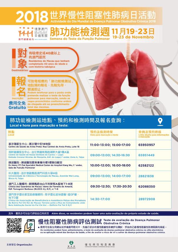 由即日起,有吸煙史或40歲以上的本澳居民可致電相應的“肺功能檢測站”預約熱線報名,名額有限,先報先得,額滿即止,有關「肺功能檢測站」地點、檢測日期和時間、報名查詢等詳情可參閱活動宣傳海報。