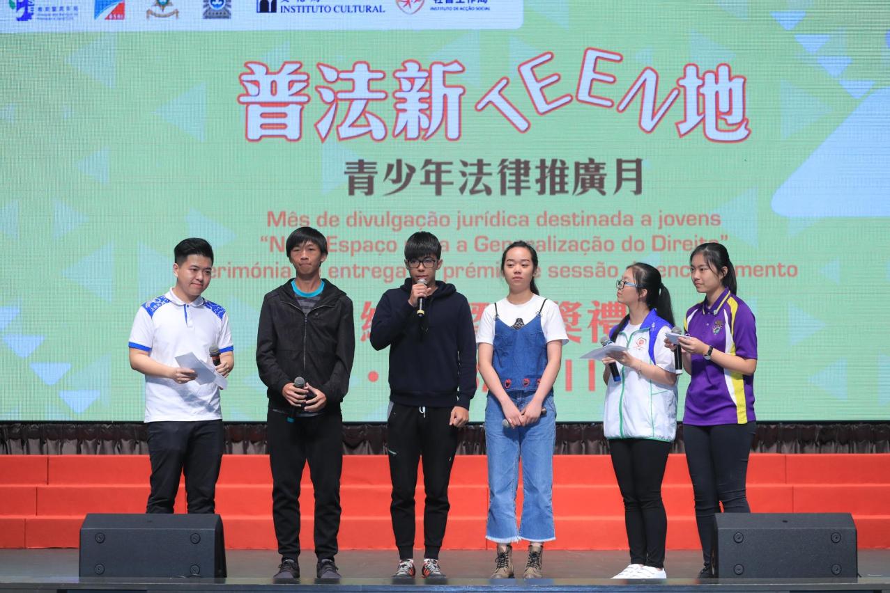 為延續推廣法律普及的工作及總結有關活動成效,上述部門於11月11日假聖保祿學校禮堂舉行“普法新TEEN地”青少年法律推廣月總結暨頒獎禮,出席嘉賓包括教青局龔志明代局長、法務局梁葆瑩副局長、法務局法律推廣及公共關係廳羅靜萍廳長、勞工事務局就業廳孟瑞怡廳長、經濟局知識產權廳鄭曉敏廳長、教青局青年廳陳旭偉廳長、民政總署市民事務辦公室公民教育及資訊處林微笑處長、司法警察局社區警務及公共關係處鄭寶湘處長、文化局文化遺產保護處蔡健龍處長、社會工作局長者服務處甘潔玲處長、治安警察局行動廳公共關係處李德輝代處長、警察總局金喆萃副警司、高等教育輔助辦公室黃月冰職務主管、非高等教育委員會委員、青年事務委員會委員,以及各參與學校/機構代表等。
