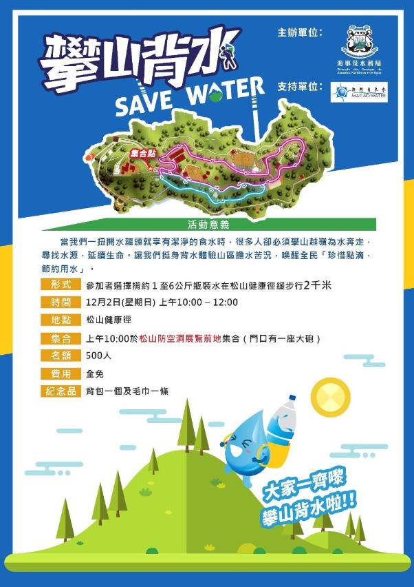 珍貴的淡水資源來之不易,為此,海事及水務局於2016年起舉辦“攀山背水”體驗活動,帶出“有水當思無水之苦”的訊息。今年的“2018攀山背水”活動將於12月2日早上10:00在松山健康徑舉行,參加者可按自身的能力,選擇背著約1至6公斤的食水緩步行約2千米,體驗內地山區人民攀山越嶺擔水的艱辛,從而更加珍惜寶貴的水資源。