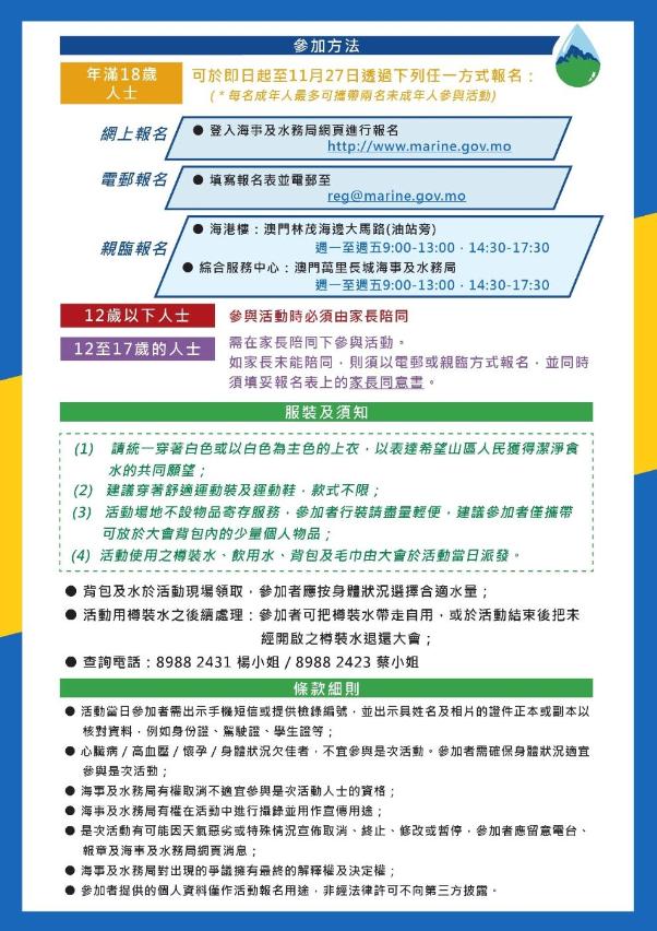 “攀山背水”體驗活動由海事及水務局主辦、澳門自來水股份有限公司支持。參加者需提前報名,名額為500人,先到先得,參加者可獲贈精美背包及毛巾。活動老少咸宜,有興趣參加的市民可於11月27日下午5時前,登入海事及水務局網頁(www.marine.gov.mo)進行網上報名,亦可選擇以電郵方式(reg@marine.gov.mo)報名,或於相應的辦公時間內親臨萬里長城海事及水務局綜合服務中心或林茂塘海港樓提交報名表。有關活動的報名方式、條款及細則可瀏覽海事及水務局網頁。