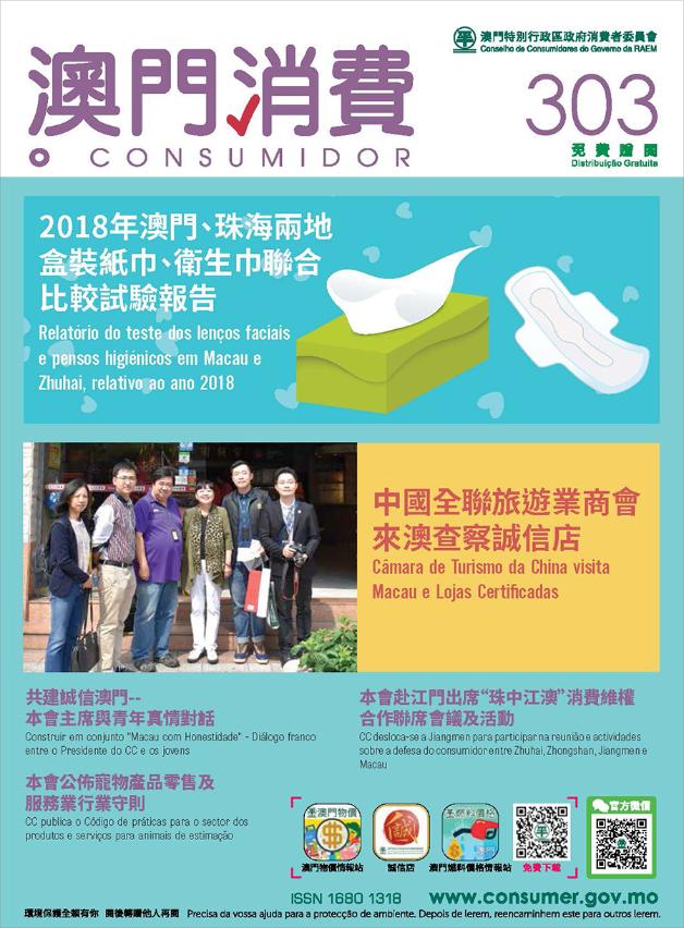 消費者委員會出版的第303期《澳門消費》刊登一項澳珠兩地盒裝紙巾及衛生巾聯合比較試驗報告,以及“誠信店”的“寵物產品零售與服務業行業守則”全文,消費者可登入消委會網站(www.consumer.gov.mo)瀏覽有關的內容。