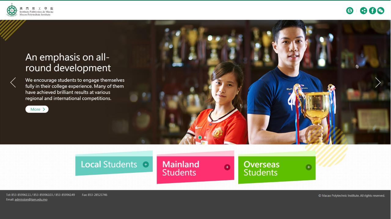 澳門理工學院招生網頁榮獲“2018 Davey Awards 國際創意比賽”銀奬(網站—教育範疇),這是繼澳門理工學院網頁獲國際獎項Horizon Interactive Awards 大學組銀奬後,再次榮獲國際網頁獎項殊榮,為澳門增光。本屆獲得相關獎項之大學尚包括:牛津大學納菲爾德學院、南加州大學、密蘇里大學、香港理工大學等。