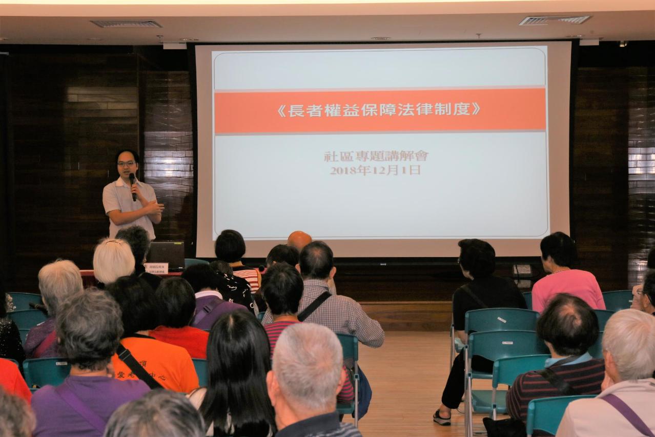 《長者權益保障法律制度》已於2018年11月19日正式生效。社工局持續透過法律專題講解會,向社會各界講解法律條文內容,讓參加者掌握立法目的與長者依法享有的權益保障,傳達維護長者權益是全社會共同責任的重要訊息;此外,講解會上亦介紹了本澳與長者相關的政策和服務現況,讓參加者瞭解特區政府在落實長者政策方面的具體成果。