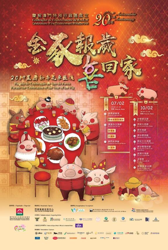 澳門特別行政區政府旅遊局將於農曆年初三(2月7日)及初六(2月10日)呈獻大型賀歲活動“慶祝澳門特別行政區成立二十周年金豕報歲喜回家2019農曆新年花車匯演"與市民及旅客同慶新春,精彩內容包括花車巡遊、大型匯演、煙花表演、花車展覽及花車投票活動。農曆新年花車匯演亦將會是旅遊局慶祝澳門特別行政區成立二十周年的首個獻禮。