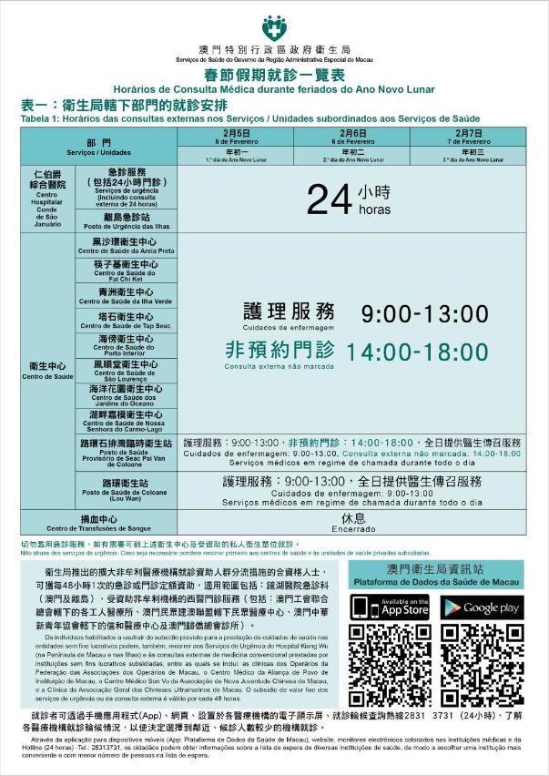 本年2月5日至7日(農曆年初一、初二、初三)是春節假期,政府部門休息,為便有需要人士就診,衛生局將維持相關醫療服務,為此作出如下就診安排: