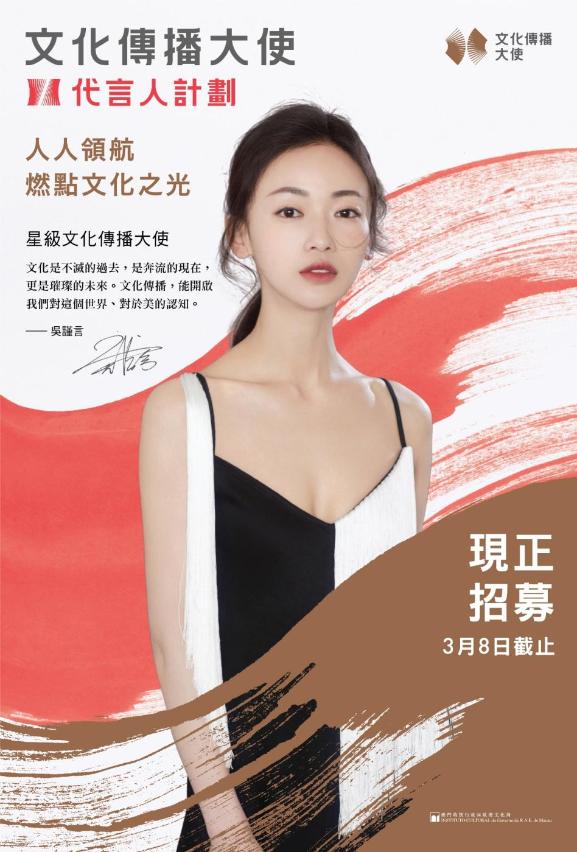 由文化局主辦的“文化傳播大使”代言人計劃現正招募學員,人氣女演員吳謹言擔任首屆代言人計劃的星級文化傳播大使,並在四月上旬親臨澳門,宣揚文化的傳承與傳播。