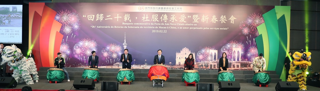 “回歸二十載,社服傳承愛”暨新春餐會中午12時於澳門旅遊塔會展娛樂中心四樓舉行,社會文化司譚俊榮司長、中聯辦副秘書長兼社會工作部黃華蓋部長、社會工作局黃艷梅局長、韓衛副局長、許華寶副局長聯同社會服務機構代表主持啟動儀式。會上,社會文化司司長辦公室葉炳權主任、全國人大代表、同善堂副主席及立法會議員崔世平,前全國人大代表及澳門街坊會聯合總會監事長姚鴻明,全國政協委員、澳門婦女及兒童事務委員會委員、澳門婦女聯合總會及母親會會長賀定一,全國政協委員、澳門工會聯合總會會長陳錦鳴,立法會議員梁孫旭、立法會議員馮家超,教育暨青年局老柏生局長、旅遊局文綺華局長、社會保障基金行政管理委員會容光耀主席、郵電局劉惠明局長、警察總局羅偉業局長助理、建設發展辦公室林煒浩主任等嘉賓,以及數百名本澳社會服務機構主管人員蒞臨餐會,歡聚一堂。