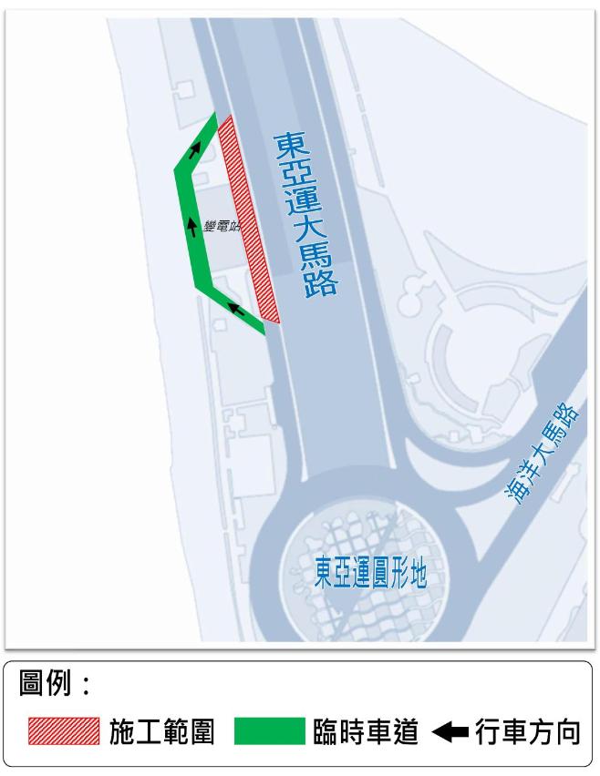 建設發展辦公室開展「東亞運大馬路下水道維修工程」第一階段施工,3月9日(周六)上午10時起,氹仔東亞運大馬路近西灣大橋往澳門方向、毗鄰電力公司變電站前的路段臨時封閉交通;同步,介乎變電站與東亞運圓形地之間新闢的臨時車行道會開通,讓車輛可以如常通往澳門半島,直至6月1日(周六),期間,相關路段之單車徑暫時停用。