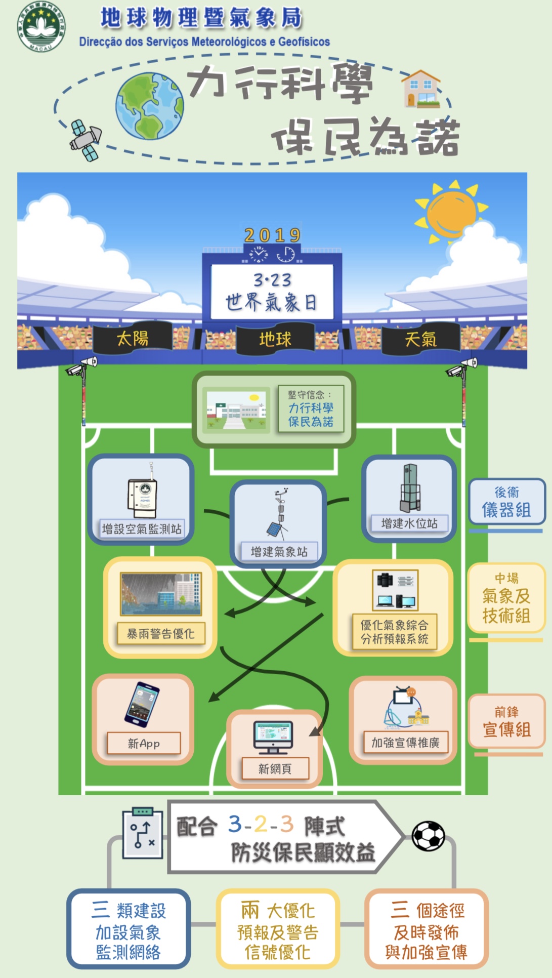 氣象縱然變化萬千,氣象局將堅持以力行科學精神,希望透過各項切合用戶需要的多元氣象服務,承諾以保障澳門市民生命及財產安全為施政目標。