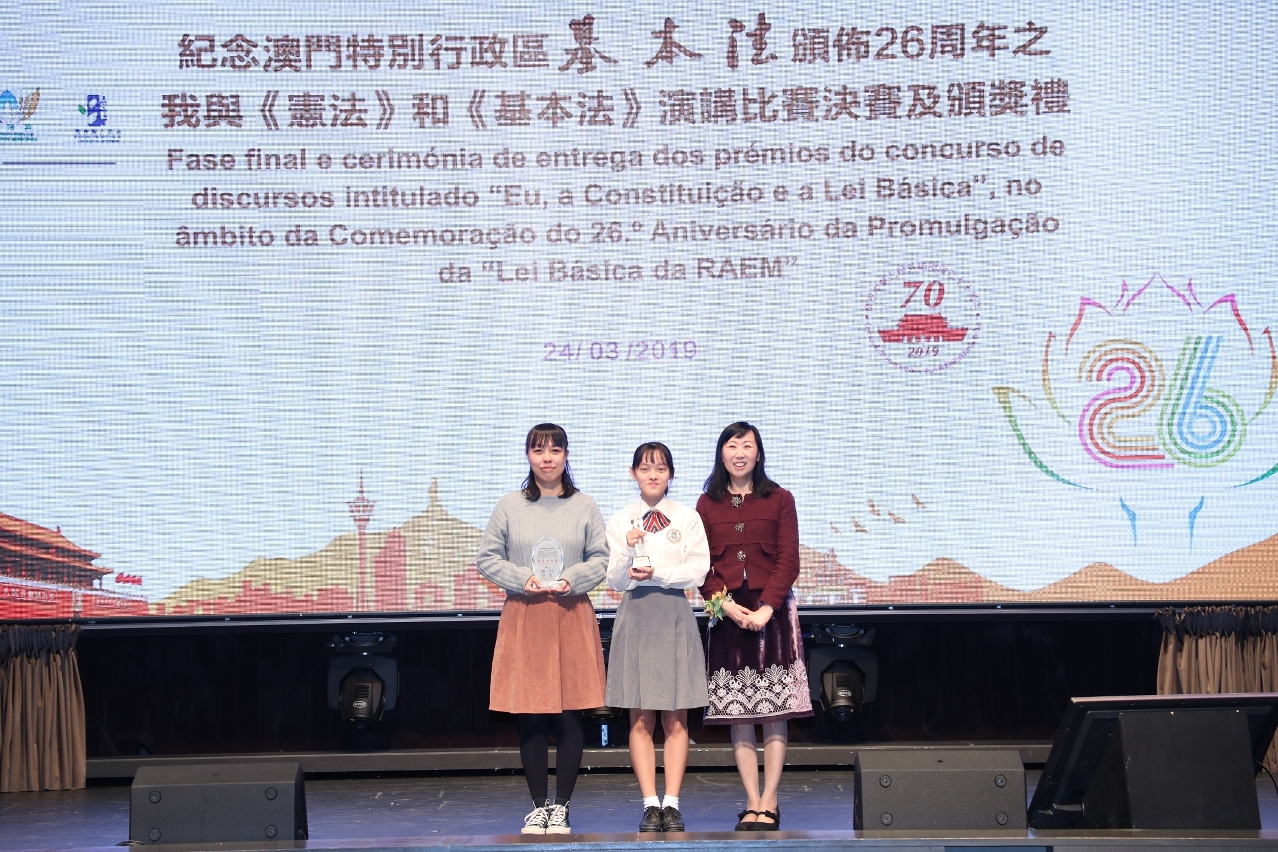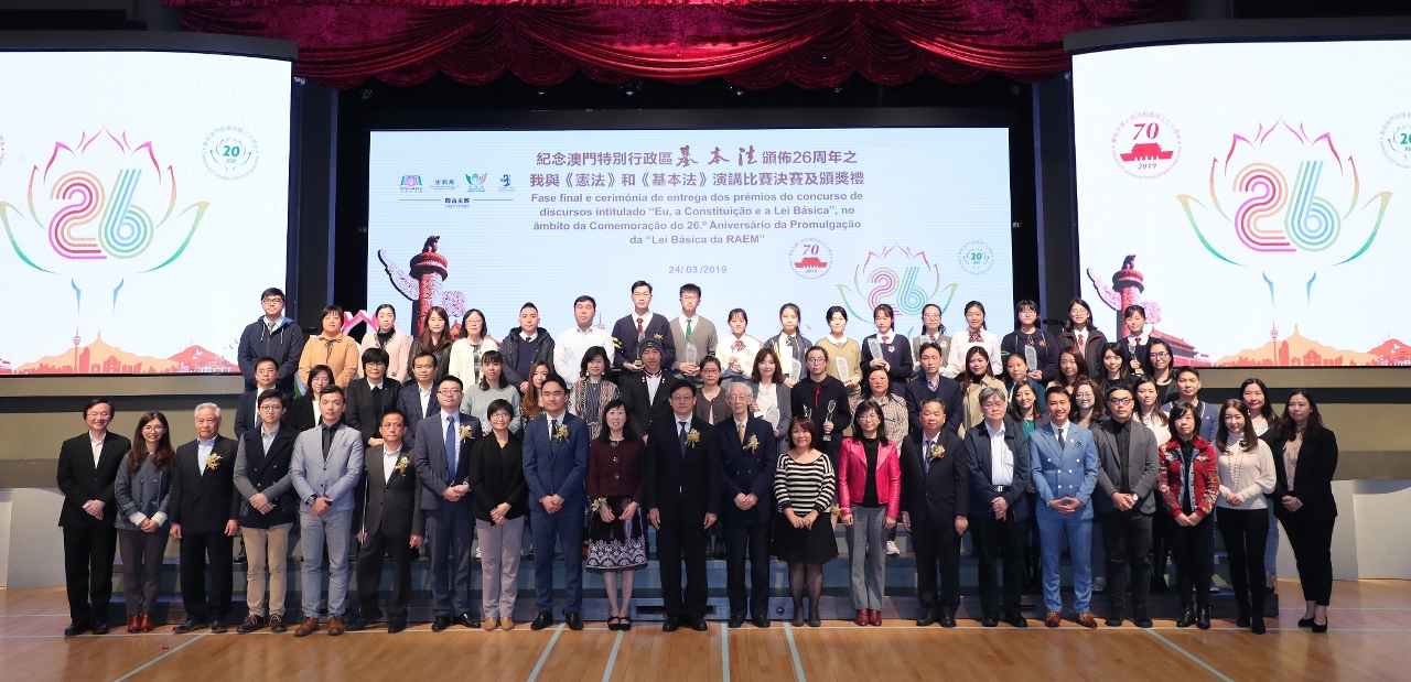 適逢新中國成立70周年和澳門回歸祖國20周年,澳門基本法推廣協會、法務局、市政署和教育暨青年局聯合主辦,澳門我是演講家協會承辦,“紀念《澳門特別行政區基本法》頒佈26周年之我與《憲法》和《基本法》演講比賽”決賽及頒獎禮,於3月24日假聖保祿學校禮堂順利舉行。