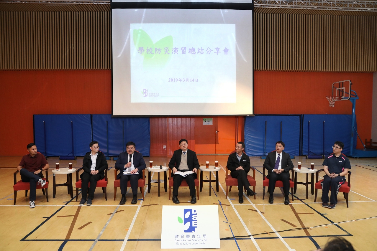 為了讓學校分享防災演習的經驗,提升演習成效,教育暨青年局於2019年3月14日下午假何東中葡小學一樓綜合運動室舉行“學校防災演習總結分享會”。教青局局長老柏生、副局長梁慧琪及龔志明,警察總局警司范家華、副警司張志輝,治安警察局警長陳曉宇,消防局副一等消防區長李梓豪、副消防區長張志明,地球物理暨氣象局氣象監察中心主任黃振星,教青局主管及77所學校領導和相關工作人員逾220人出席了分享會。