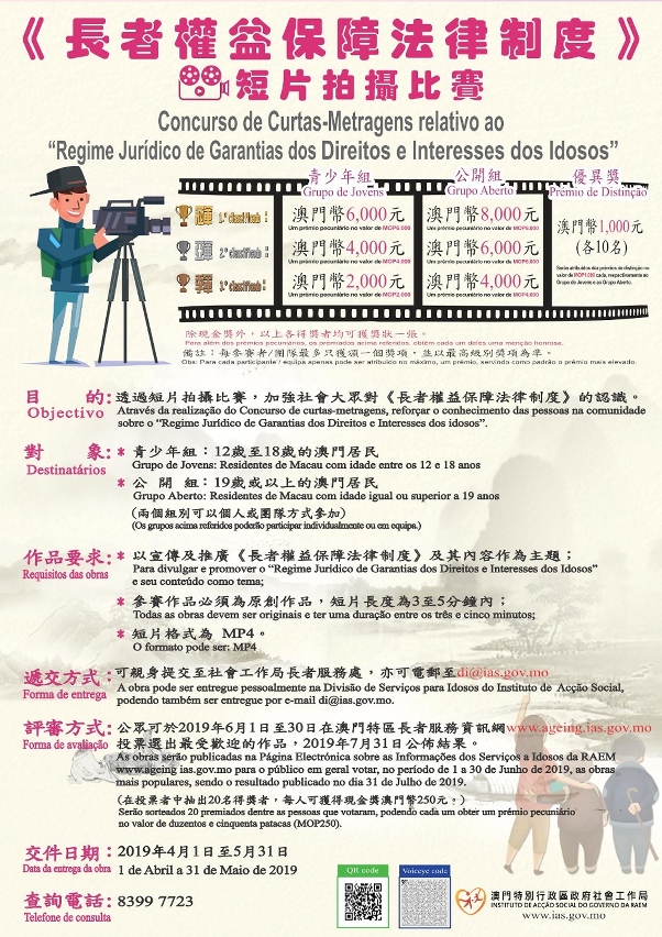 比賽分為青少年組及公開組,參加者需以《長者權益保障法律制度》為主題,拍攝3至5分鐘的短片(格式須為MP4),並於4月1日至5月31日期間電郵至di@ias.gov.mo,或遞交至巴掌圍斜巷19號南粵商業中心13樓社工局長者服務處。