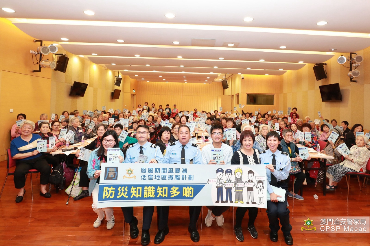 講座上,治安警察局的代表介紹風暴潮疏散撤離計劃的內容及分區進行疏散撤離的概念,提醒巿民在颱風來臨前應留意氣象部門的風暴路徑預測、做好窗戶的防風措施、於家中儲備適量的乾糧、食水和應急物品;講解選擇疏散撤離路線的考慮要點如留意受水浸道路可能存在的安全隱患、應儘量遠離海邊等;應留意最新的天氣消息,在收到民防部門發出的疏散撤離指示,應立即帶同家人及必須的個人物品儘快到所處區域就近的避險中心或安全的地方暫避。