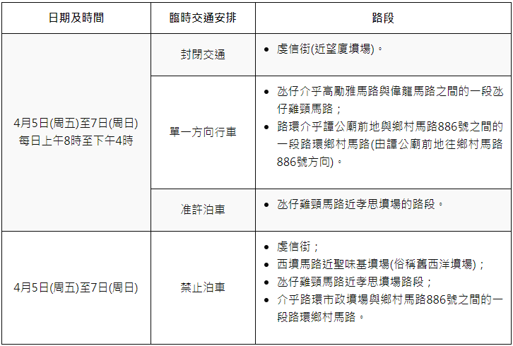 因應清明節市民前往掃墓,多處道路於周五至周日將實施臨時交通安排;治安警察局將加派警力於各個祭祀場所一帶道路疏導交通;此外,交通事務局屆時將安排「37T孝思接駁專線」接駁掃墓地點與氹仔市區,供公眾免費搭乘,公眾可瀏覽交通事務局相關資訊:https://news.gov.mo/detail/zh-hant/N19DBkSbPq?2。