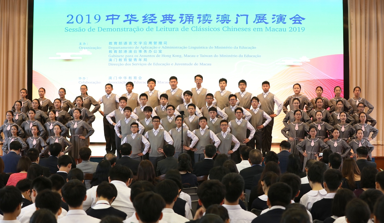 由國家教育部語言文字應用管理司、港澳台事務辦公室及教育暨青年局主辦,澳門中華教育會協辦,南京藝術學院、天津師範大學、上海師範大學聯合承辦的“2019中華經典誦讀澳門展演會”於2019年4月10日下午假濠江中學附屬英才學校禮堂舉行。社會文化司司長譚俊榮、國家教育部機關服務局局長葛振江、教青局局長老柏生、中央人民政府駐澳門特別行政區聯絡辦公室教育與青年工作部部長徐婷、教青局副局長梁慧琪及龔志明、國家教育部語言文字應用管理司宣教處副處長張艷、港澳台事務辦公室幹部李波、澳門中華教育會會長何少金、澳門天主教學校聯會會長周伯輝、澳門公職教育協會理事張佩菁,以及澳門各中小學學校校長、代表與逾五百名師生嘉賓出席。展演會上,葛振江向譚俊榮致送“中華經典資源庫”光碟,寓意中華一家,共同傳承祖國經典文化。
