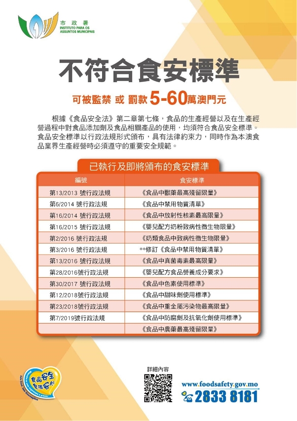 有關食品安全法、標準及指引的詳細內容已上載至「食品安全資訊」網頁www.foodsafety.gov.mo及「食安資訊App」,歡迎業界及市民瀏覽以瞭解更多。