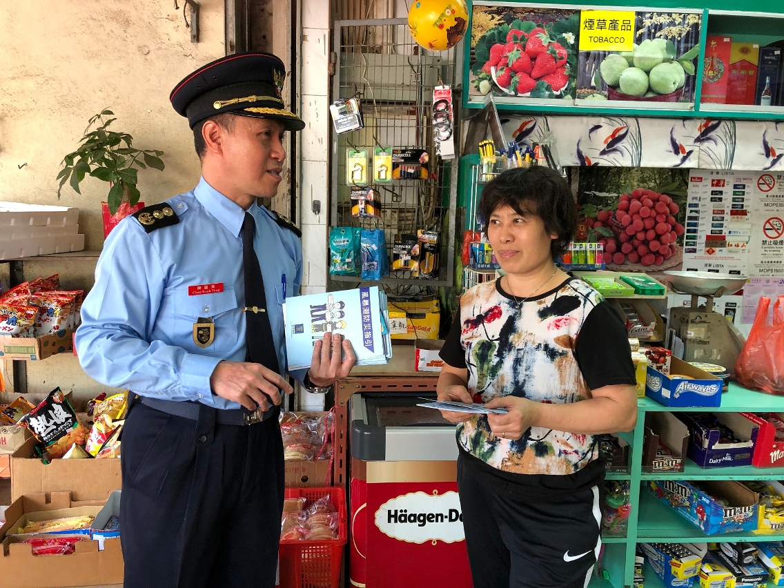 保安高校陳國棠副消防總長、徐小華副警司、李嘉儀副警司及黃仲勝副一等消防區長,於(16日)下午前往路環市區進行“颱風期間風暴潮低窪地區疏散撤離計劃”的宣傳活動,向當地商戶及居民派發關於《颱風期間風暴潮低窪地區疏散撤離計劃》、《風暴潮防災指引》及《風暴潮高點及低窪地區音頻警報信號》的小冊子,並向其講解相關小冊子內的信息,同時向市民介紹4月27日由多個部門聯合進行的“水晶魚2019”全澳大型民防演習,以及報名的方法。