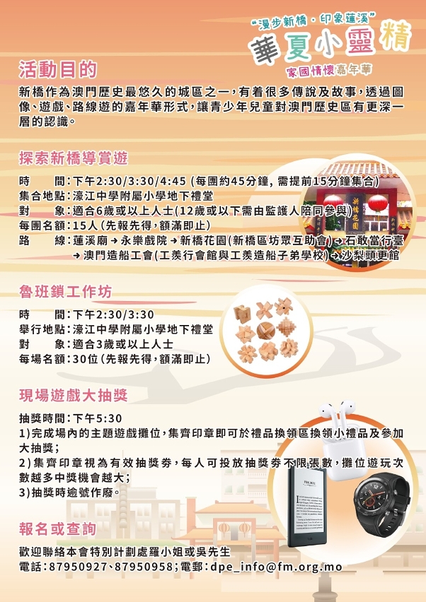“華夏小靈精家國情懷嘉年華"以走進社區形式舉辦,本次嘉年華以新橋區為主題,內容包括:新橋印象看板區、歷史知識攤位遊戲、探索新橋導賞遊、魯班鎖工作坊、小靈精留影區、禮品換領等,更有壓軸大抽獎環節。其中探索新橋導賞遊及魯班鎖工作坊名額有限,額滿即止。