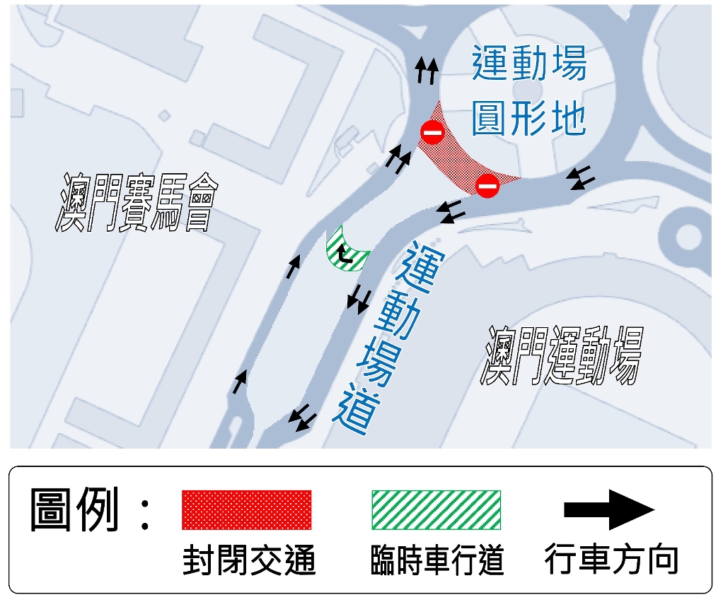 配合土地工務運輸局安裝行人天橋,6月13日(周四)至18日(周二)氹仔運動場圓形地近運動場道的路段禁止車輛通行,車輛可取道於運動場道近運動場圓形地路段、新闢的臨時車道駛回原有的行車路線。
