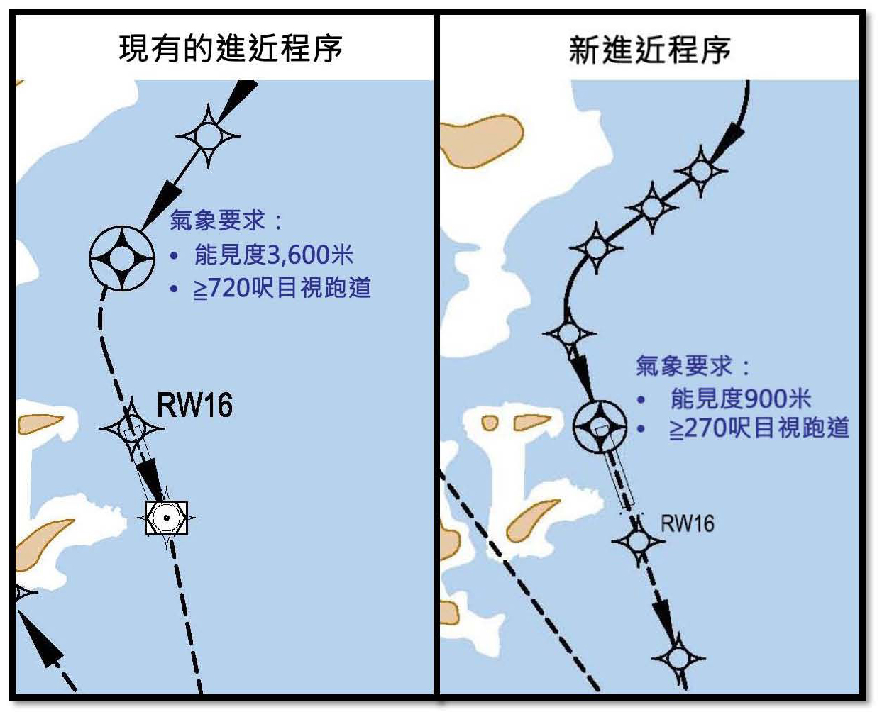 民航局公佈了新的航機進近程序,並已審批了本地航空企業使用新程序的運行申請。於今天起(6月13日),經民航局審批後,航空企業可透過優化的導航技術和進近程序,在使用16號跑道(由北向南)降落時減少由氣象因素所導致的復飛或轉飛的情況,大大地提高了使用16號跑道的營運安全和效率。