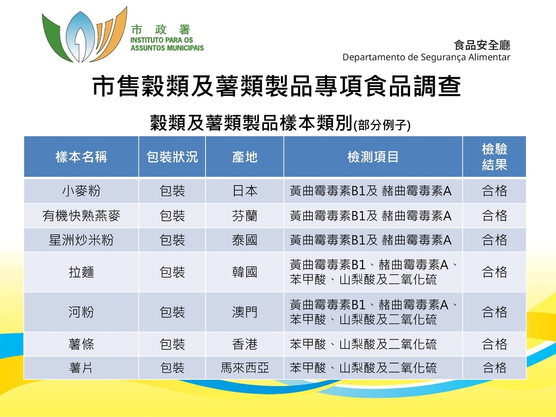 是次專項食品調查中,市政署分別抽查本澳百貨公司、超級市場等店舖出售的穀類及薯類製品,並進行真菌毒素及食品添加劑的檢測,包括黃曲霉毒素B1、赭曲霉毒素A、山梨酸、苯甲酸及二氧化硫。調查結果顯示,所有樣本均未見異常。