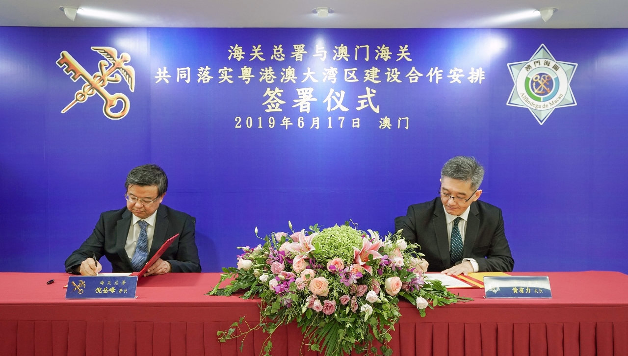 海關總署署長倪岳峰與澳門海關關長黃有力今天(17日)下午在澳門海關總部大樓共同簽署《海關總署與澳門海關共同落實粵港澳大灣區建設合作安排》,進一步加強澳門海關與內地海關及其他相關口岸執法部門的交流與合作,以推進貨物、人員等在大灣區內便捷流動。