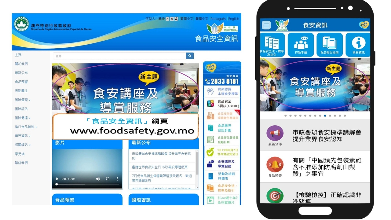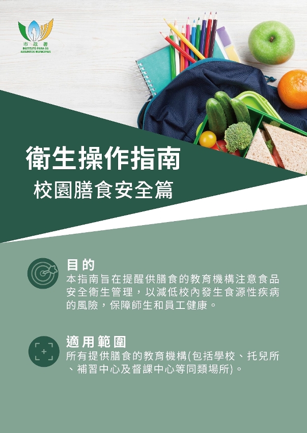 另外,為提升參與校園供餐人員的食安操作水平,強化學校食品安全管理,市政署新編製了《衛生操作指南─校園膳食安全篇》,簡明扼要把製作校園膳食時須要注意的食品安全及衛生操作要點羅列,以供業界依循。有關《衛生操作指南─校園膳食安全篇》,以及一系列的衛生指引,包括《學校膳食衛生安全指引》、《學校膳食外判指引》、《團體膳食供應商食品衛生安全指引》及《私立補充教學輔助中心之食品安全衛生管理指引》均已上載食品安全資訊網www.foodsafety.gov.mo及食安資訊手機應用程式,歡迎查閱。