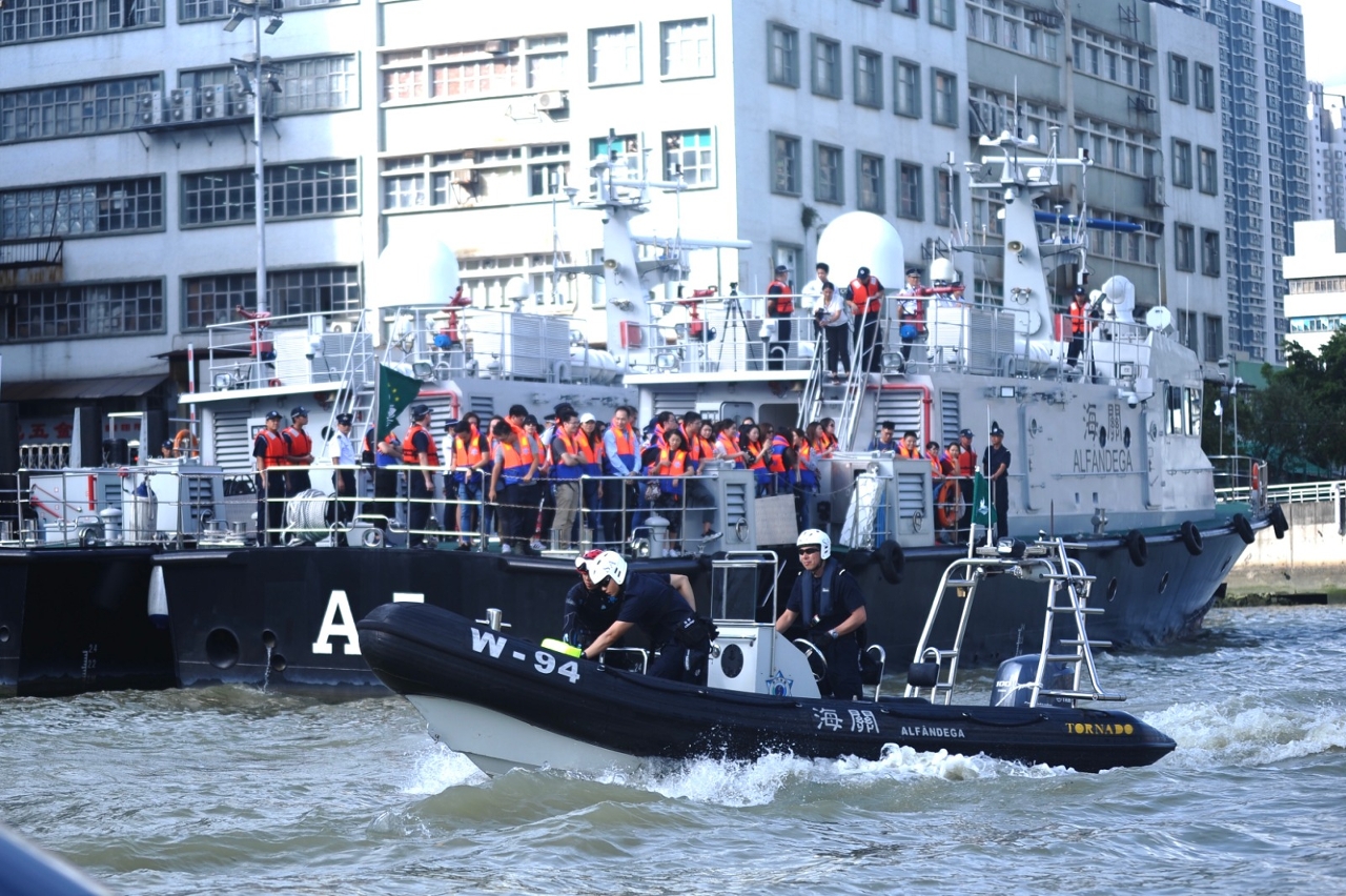 交流活動完結後,海關安排了一場應對海上暴力事件的演練,模擬海關快艇對一艘可疑快艇進行追截,展示如何利用戰術駕駛方式截停可疑快艇及應對暴力反抗行動。及後,黃文忠帶領一眾青年登上海關輪出海,實地了解澳門管理海域範圍和海關於海域內的執法管理工作。
