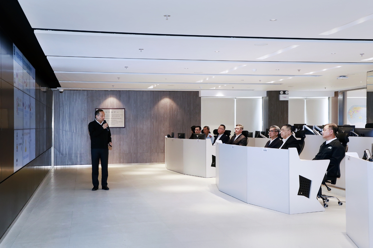 行政長官在會議前視察民防行動中心,在控制室聽取警察總局局長助理吳錦華匯報民防工作、應急指揮應用平台的構建及民防中心擴建的情況及進度。