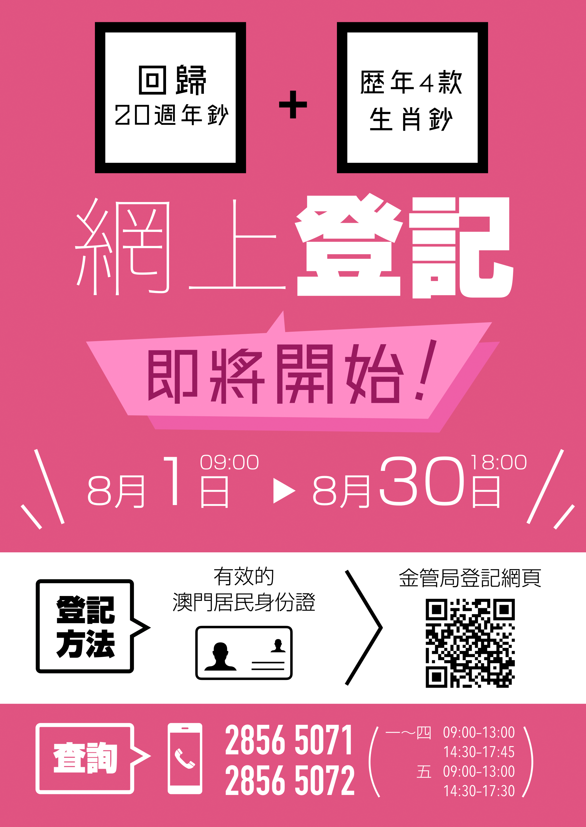 澳門回歸祖國二十週年鈔及歷年已發行的四款生肖鈔(包括丙申猴年、丁酉雞年、戊戌狗年及己亥豬年)之網上登記將於2019年8月1日上午9時起開始,屆時接受澳門居民進行網上預約兌換登記,為期四個星期,至2019年8月30日下午6時止。澳門金融管理局呼籲有意兌換上指鈔票之澳門居民留意登記期限,以免錯失兌換機會。